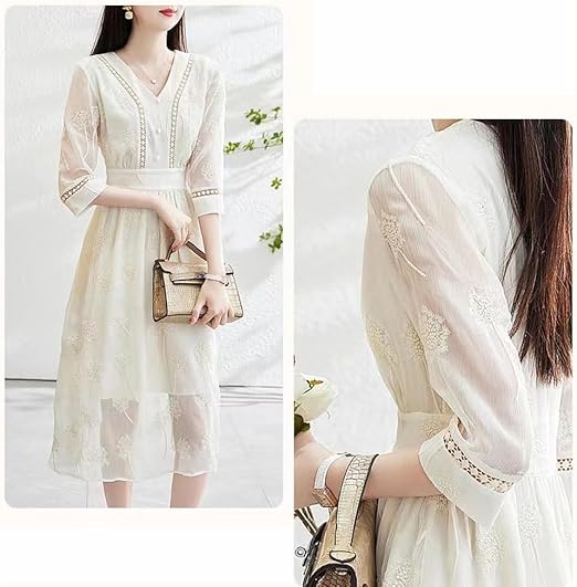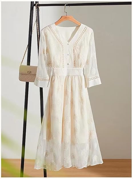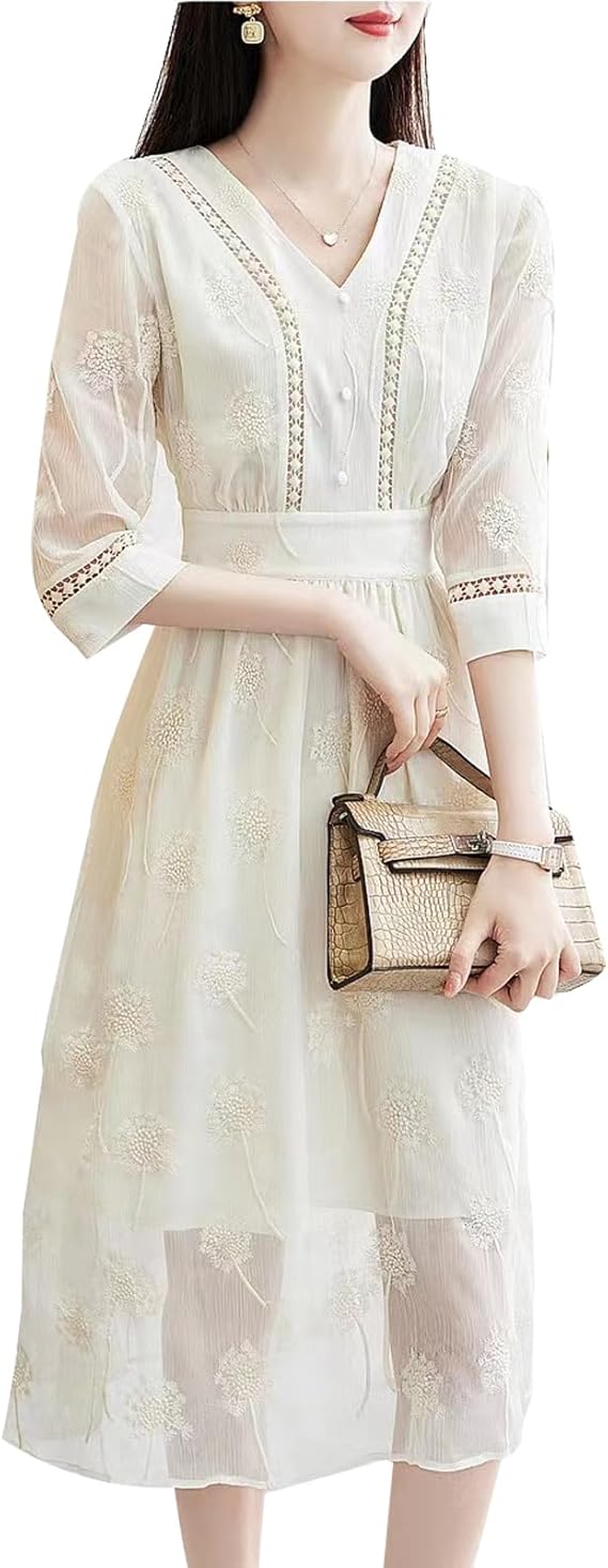 The material is made of polyester. The V-neck design controls the overall sweetness, showing the charming clavicle, giving a mature and cute impression. The loose three-quarter sleeves are used to keep up with the trend and enhance the fashion sense. The high waist setting covers the belly and thighs that are concerned, revealing the thinnest part, and has a superior slimming effect. With embroidery processing, it is breathable and comfortable in summer.