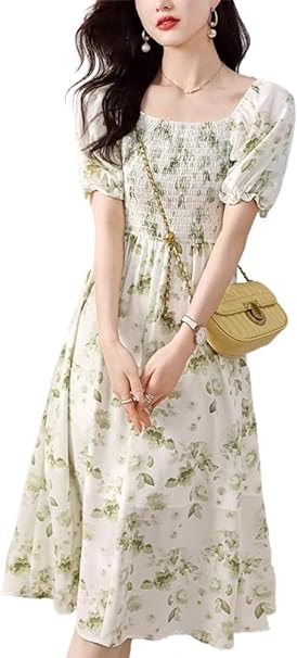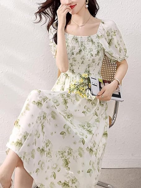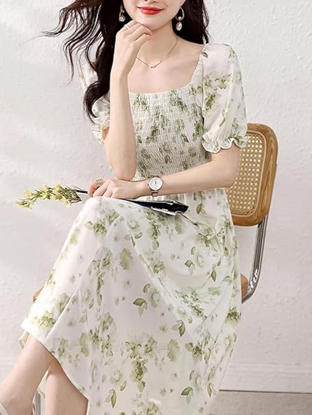 Elegant and fashionable women's short-sleeved printed dress. The chiffon mid-length dress is very light and soft, with good drape and is comfortable to wear! The fluffy flared skirt shows a mature and cute feeling. The U-neck dress is full of femininity, and you can enhance your feminine charm by wearing this one!